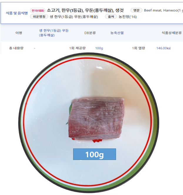 소고기 홍두깨살 100g은 한토막 정도의 분량이며, 칼로리는 대략 150(kcal)정도 된답니다. 목심이 100g당 350kcal와 비교하면 약 40%에 불가합니다. 지방보다는 단백질 위주로 구성되어있기에 비교적 칼로리가 적게 나가며 장조림용으로 많이 사용되곤합니다.