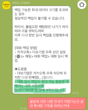 대화 임시 백업의 최대 가능 용량에 대해서는 내부 사항이라 못 알려준단다 ㅎㅎㅎ 그러니 톡서랍 유료서비스를 이용하면 대화 사진/동영상 파일 전부 보관할 수 있단다~ 2~3시간동안 대화를 삭제한 시간이 아까워서 도저히 톡서랍 플러스를 구독 할 수가 없었다~눈 꼭 감고 한 달 결제하고(2900원?) 다시 구독 취소할까도 생각했는데... 2~3시간동안 데이터 정리의 노가다를 시킨게 괘씸하고 억울해서 구독을 할 수 가 없었다~ 결론적으로 카카오톡 AI 상담사와 싸우다가 ㅋㅋㅋㅋㅋㅋㅋ 임시백업 조차 못한(안한) 상태로 기기변경을 완료했다~ 과거 대화가 궁금하고 필요한 정보들이 존재하지만 괜찮...다? 음하하~