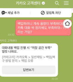 이정도면 되겠지? 하고 다시 백업을 시작했다~ 하지만 웬걸 매번 저장 공간이 부족하다고 한다~ 더 줄이기 시작했다. 진짜 진짜 최신 중요한 톡방만 남겨두고 전부 싸그리 삭제했다~~그래도 저장공간이 부족하단다~~그렇다면 저장가능한 무료 공간이 얼마나 되냐고?