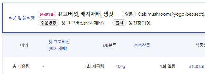 생 표고버섯 100g은 30kcal정도 된답니다. 보통 채소 1인 1회 분량은 70g이며 20kcal로 저열량이기에 곡류, 육류보다는 채소류를 많이 섭취하는걸 권장드립니다.